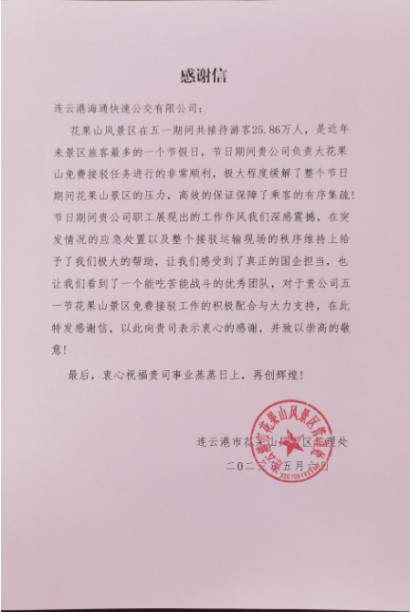 近日,花果山景区向市交通控股必威app最新版下载,必威(中国)权属公交必威app最新版下载,必威(中国)送来了一封感谢信,感谢公交必威app最新版下载,必威(中国)在五一期间高效的保障了游客的有序疏散。