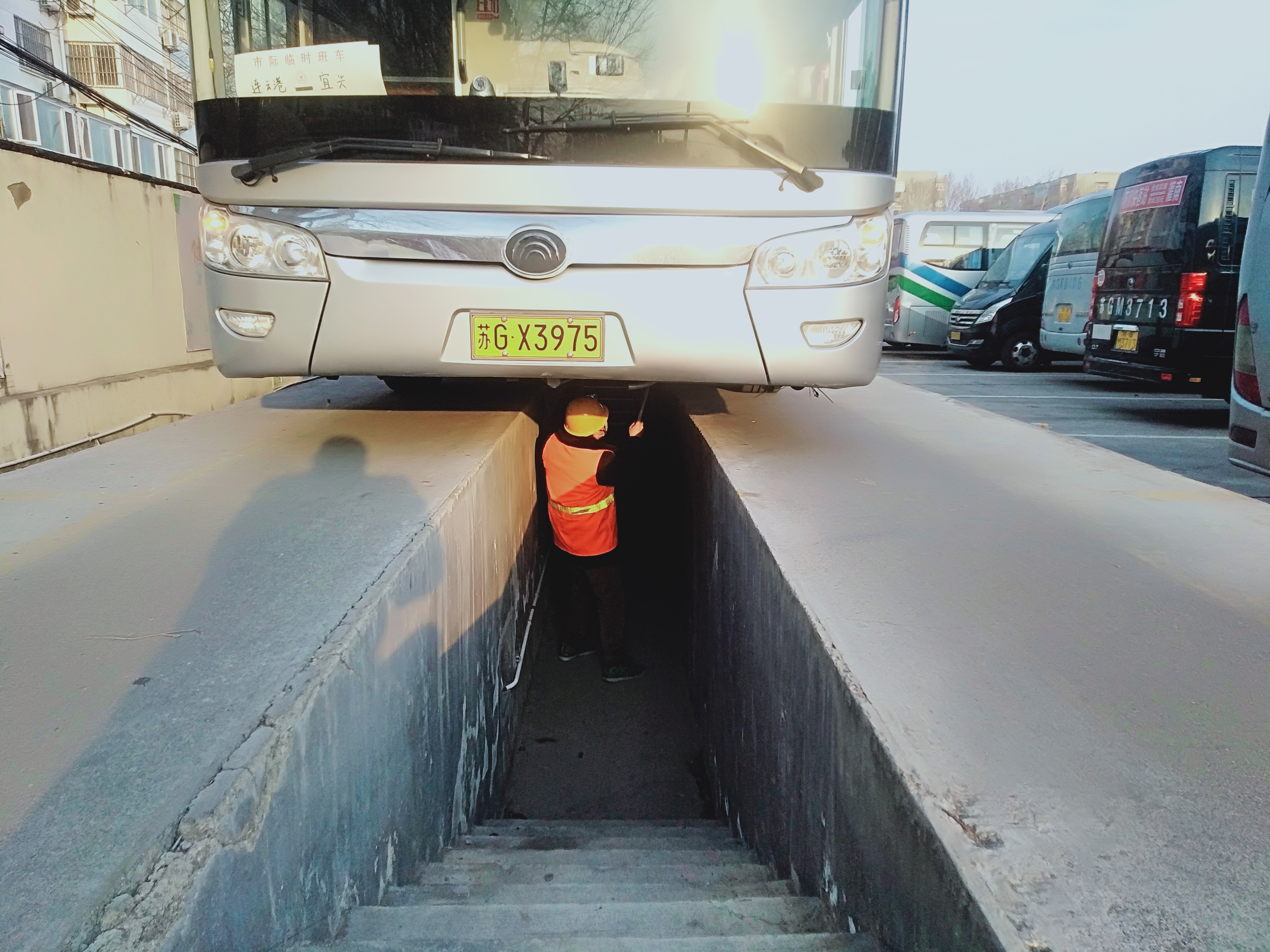 凌晨5点50分,天还未亮,寒风刺骨,新浦汽车总站、苏欣快客站车辆例检站却已经灯火通明。例检人员裹上厚厚的棉袄,钻进检测通道,寒冷让他瑟瑟发抖……师傅您好,请熄火!请在指挥下完成规定操作。依次开启近光灯、远光灯、转向灯,然后踩住刹车,挂倒挡!”例检员背顺口溜似地说道。“师傅您的灯光没有问题,现在请左右打方向盘,我为您检查下转向系统和底盘”、“车辆内部安全锤、灭火器等安全设施齐全!”,随后开具安全例检合格通知单交付于驾驶员的手中,并示意车辆例检合格,可予放行。