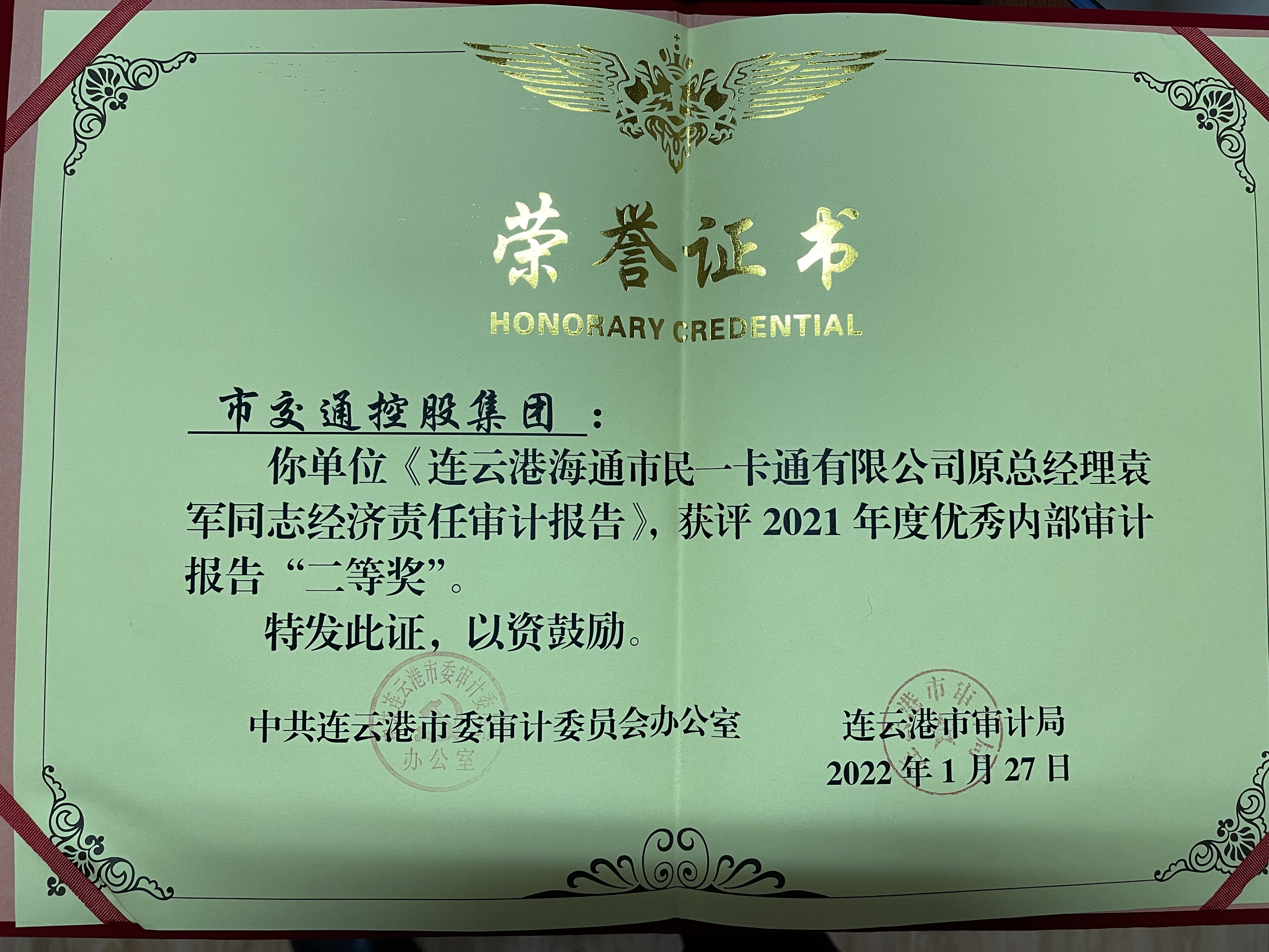 近日,必威app最新版下载,必威(中国)审计部出具的审计报告——《连云港海通市民一卡通有限公司原总经理袁军同志经济责任审计报告》,在审计局组织有关人员对2021年度全市内部审计报告开展评选工作中获得连云港市委审计委员会和连云港市审计局共同颁发的2021年度优秀内部审计报告“二等奖”。
