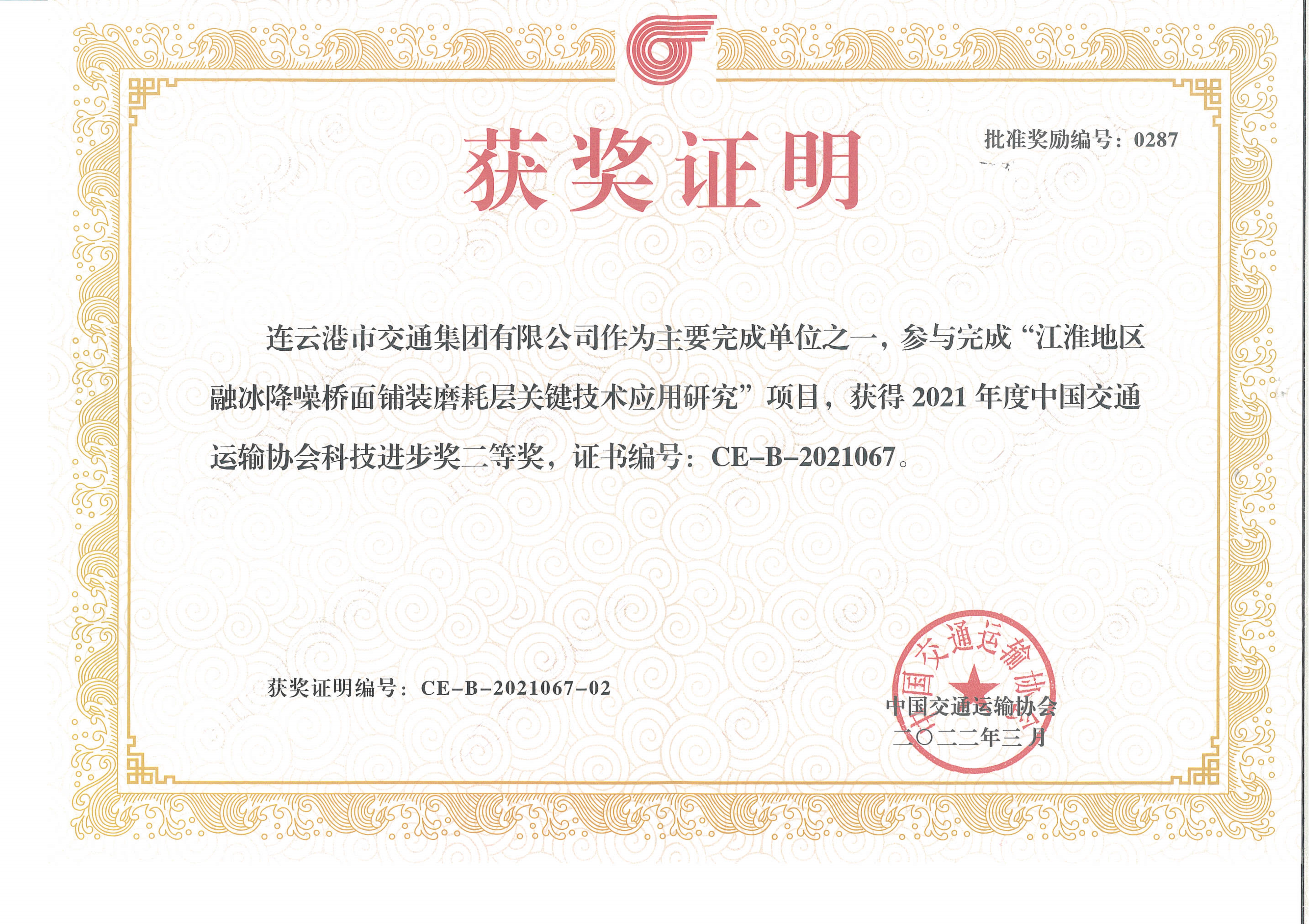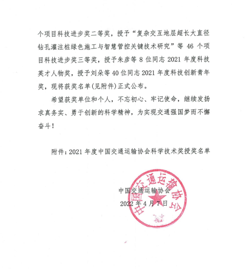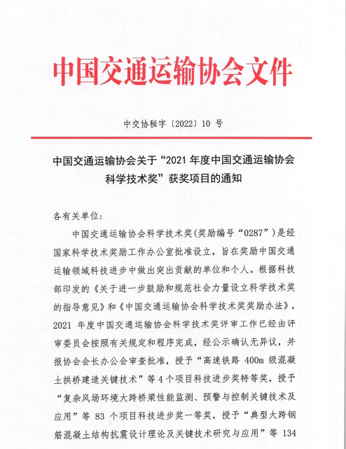 近日,中国交通运输协会发布了“2021年度中国交通运输协会科学技术奖”获奖项目名单,交通必威app最新版下载,必威(中国)联合苏交科必威app最新版下载,必威(中国)等单位申报的“江淮地区融冰降噪桥面铺装磨耗层关键技术应用研究”项目荣获中国交通运输协会科技进步奖二等奖。
