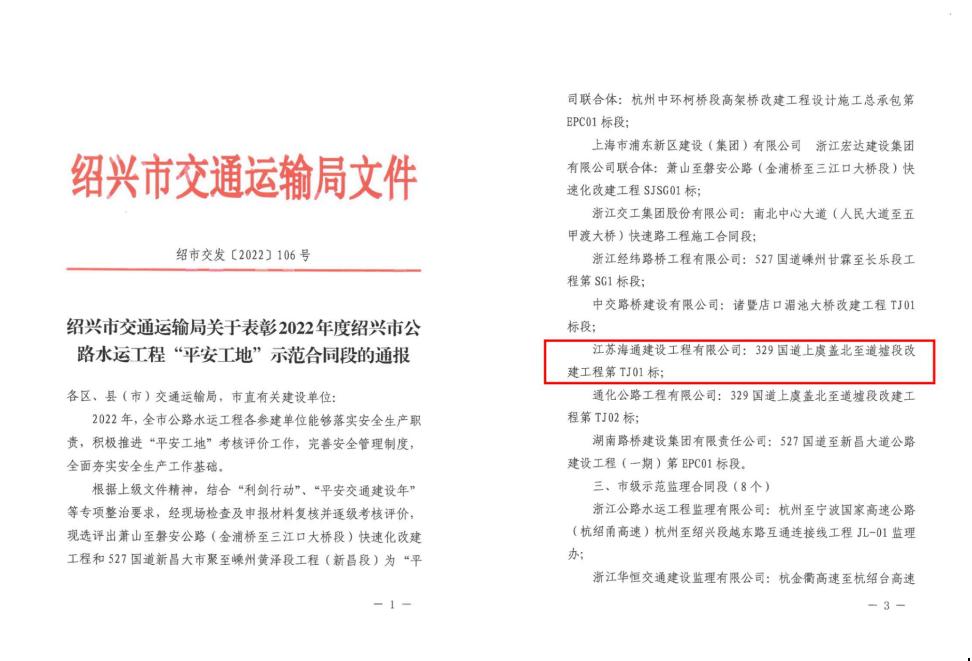 近日,从绍兴市交通运输局处获讯,由江苏海建公司承建的329国道上虞盖北至道墟段改建工程第TJ01标荣获绍兴市市级示范“平安工地”称号。